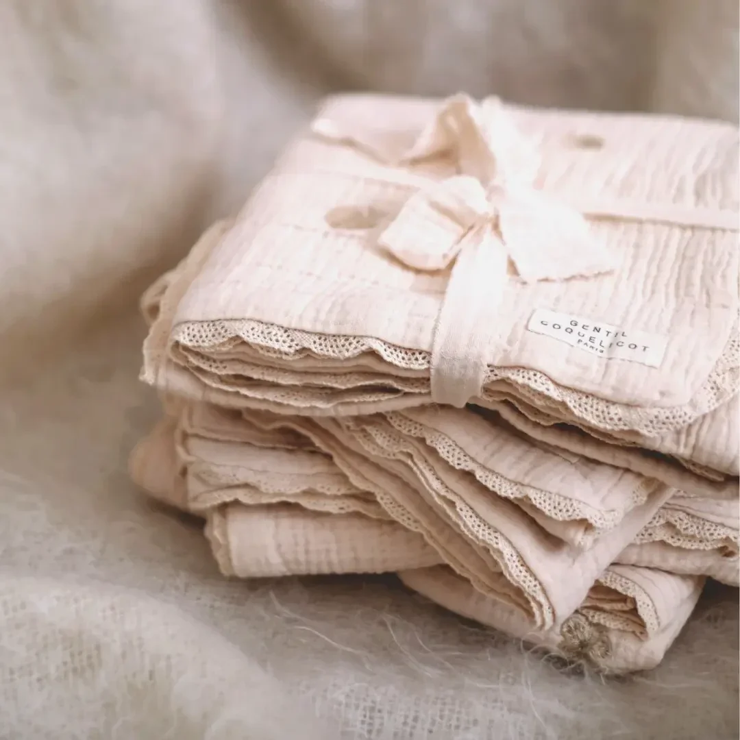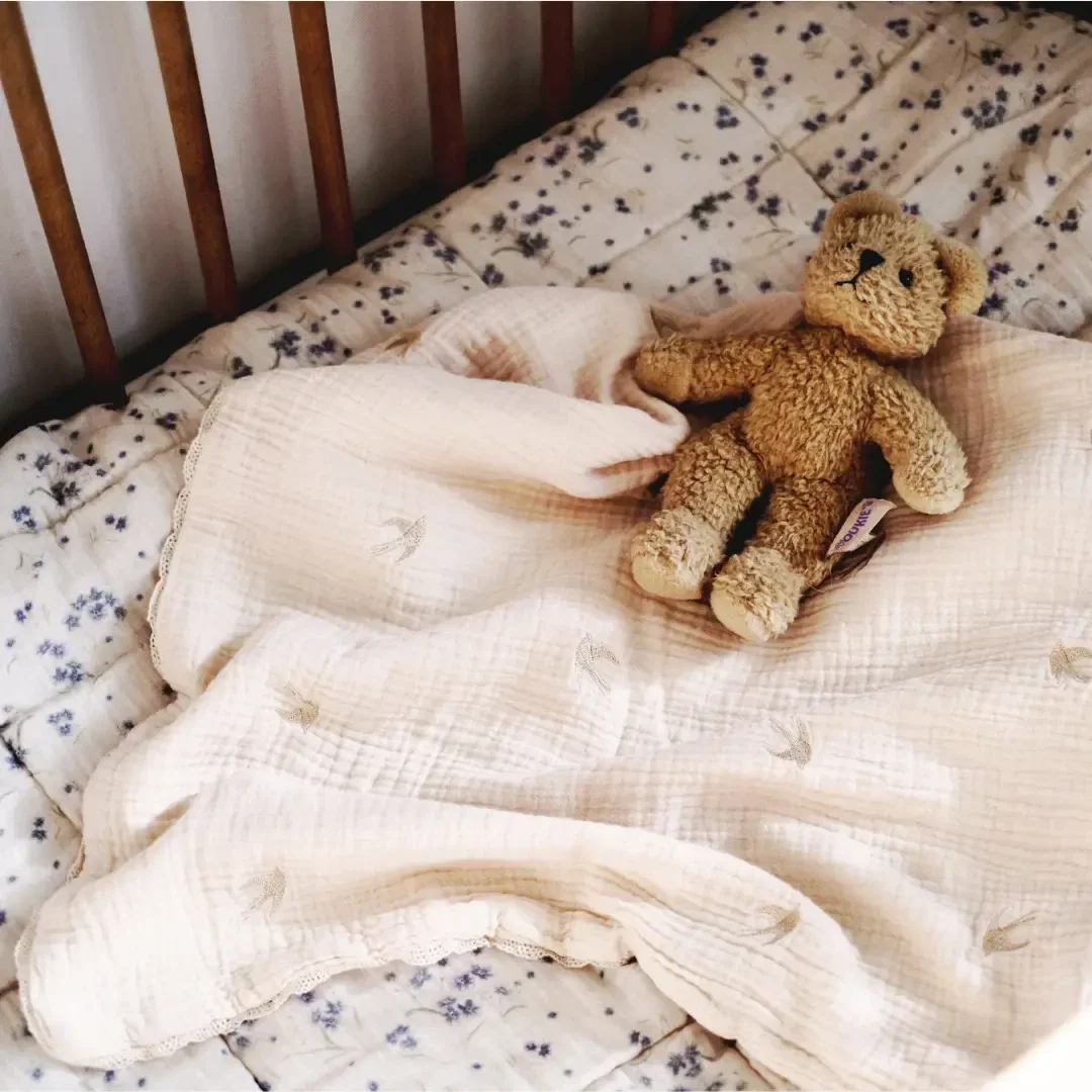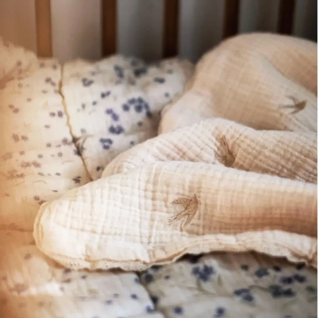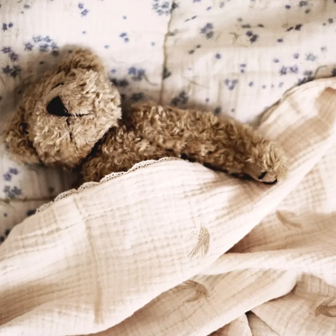 Dekentje met handgeborduurde zwaluwen met kant van het Franse merk Gentil Coquelicot. Dubbel gevoerde hydrofiele stof.